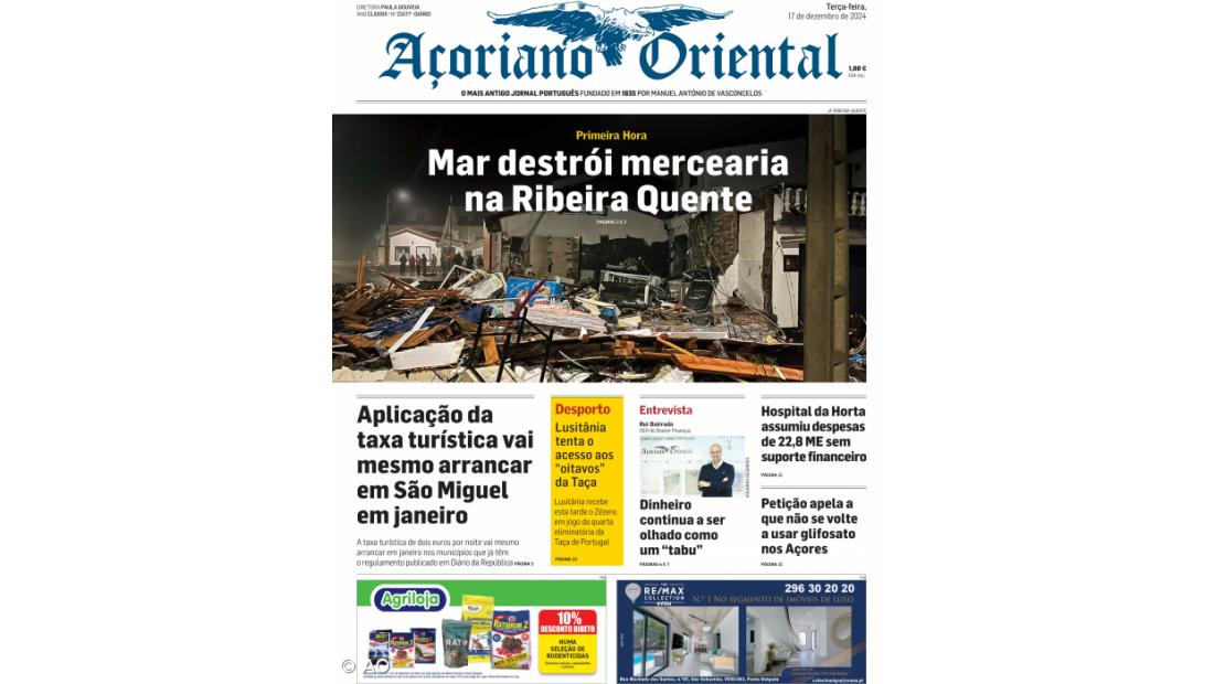 Os estragos provocados pela forte ondulação nas freguesias da Ribeira Quente e São Roque estão em destaque no Açoriano Oriental de terça-feira, 17 de dezembro de 2024.