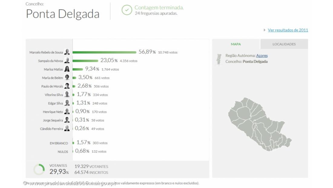 É o seguinte o quadro completo dos resultados do concelho de Ponta Delgada, de acordo com as votações divulgados pela Secretaria-Geral do Ministério da Administração Interna – Administração Eleitoral:
