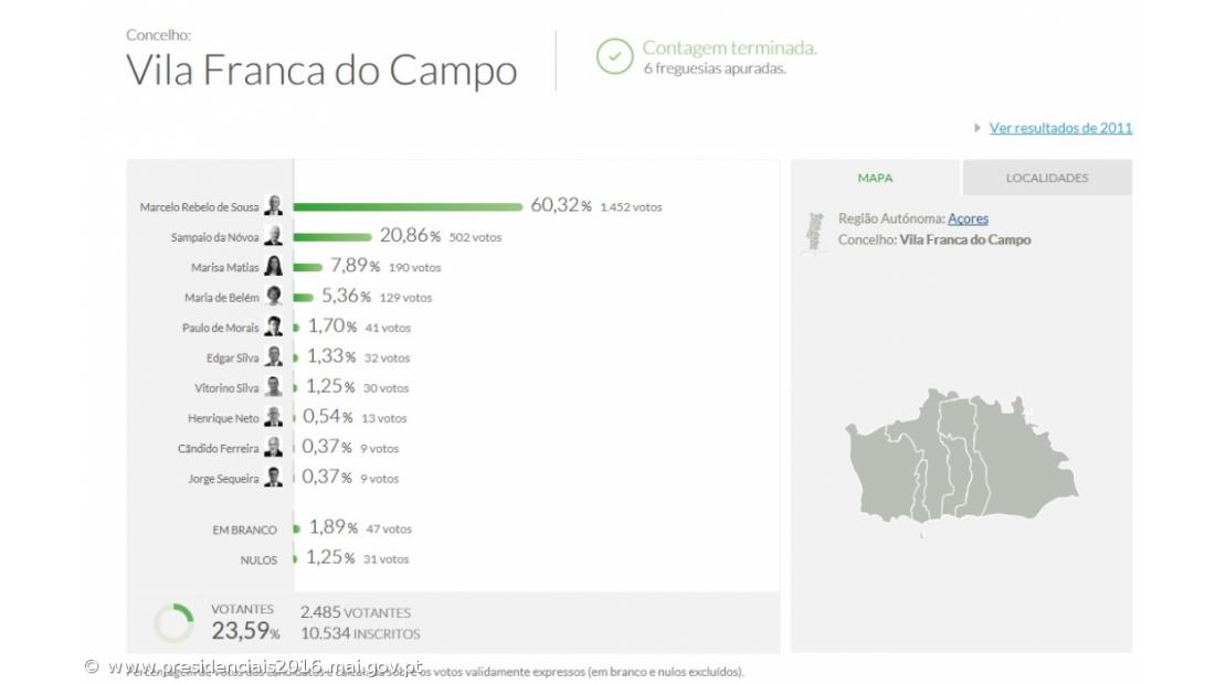 É o seguinte o quadro completo dos resultados do concelho de Vila Franca do Campo, de acordo com as votações divulgados pela Secretaria-Geral do Ministério da Administração Interna – Administração Eleitoral:
