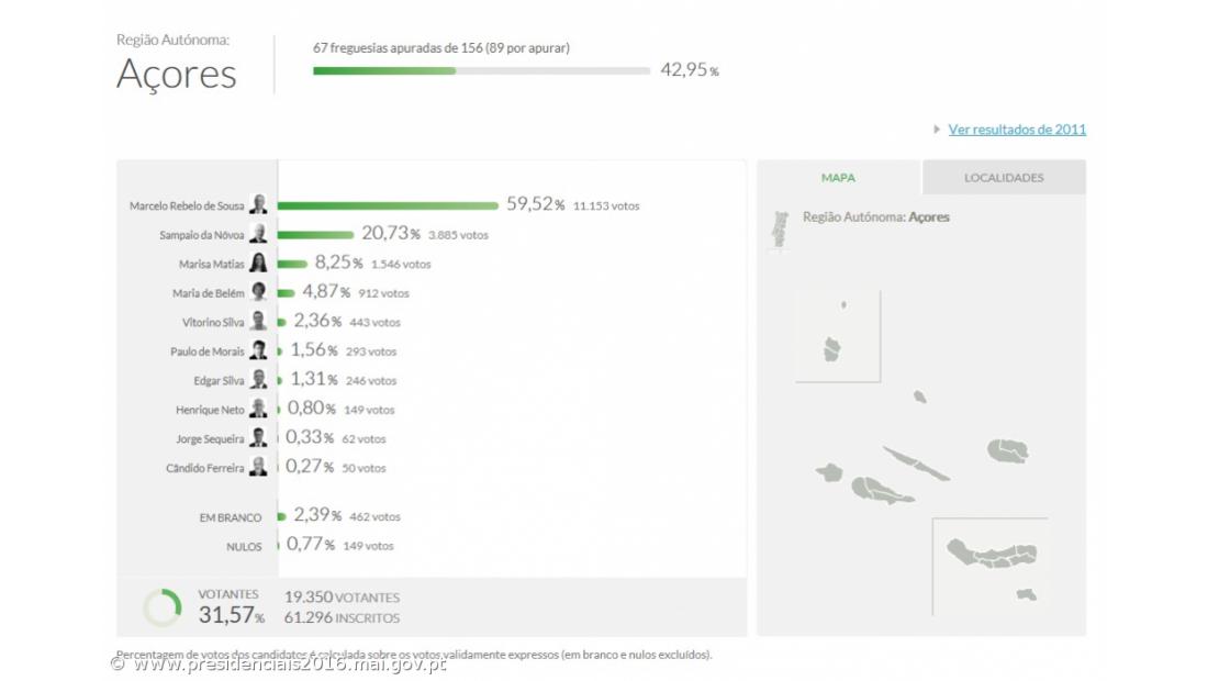 Com 42 por centos dos votos dos Açores apurados, Marcelo Rebelo de Sousa é o candidato mais votado com 59,52 por cento dos votos.