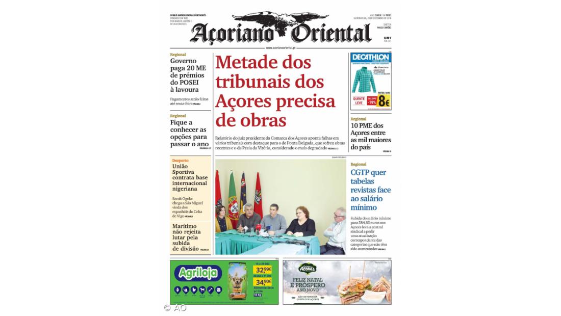 O destaque fotográfico do jornal vai para a reivindicação da CGTP de uma atualização das tabelas salariais em função da subida anunciada do salário mínimo nos Açores para 584,85 euros, para evitar discriminação face a outras classes profissionais logo acima do salário mínimo e que não têm sido aumentadas.