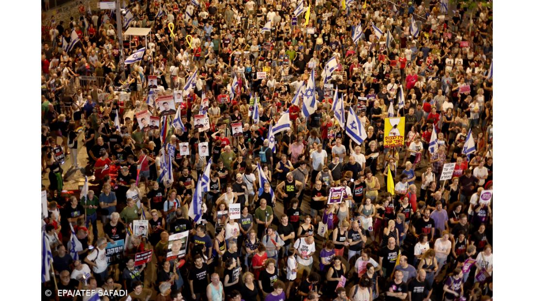 “Netanyahu, assina o acordo antes de voar para DC [Washington]”, foi escrito em faixas e entoado pelos manifestantes, que incluíam familiares e pessoas próximas dos reféns e uma ampla variedade de grupos civis antigovernamentais, que exigiram igualmente a demissão do primeiro-ministro.