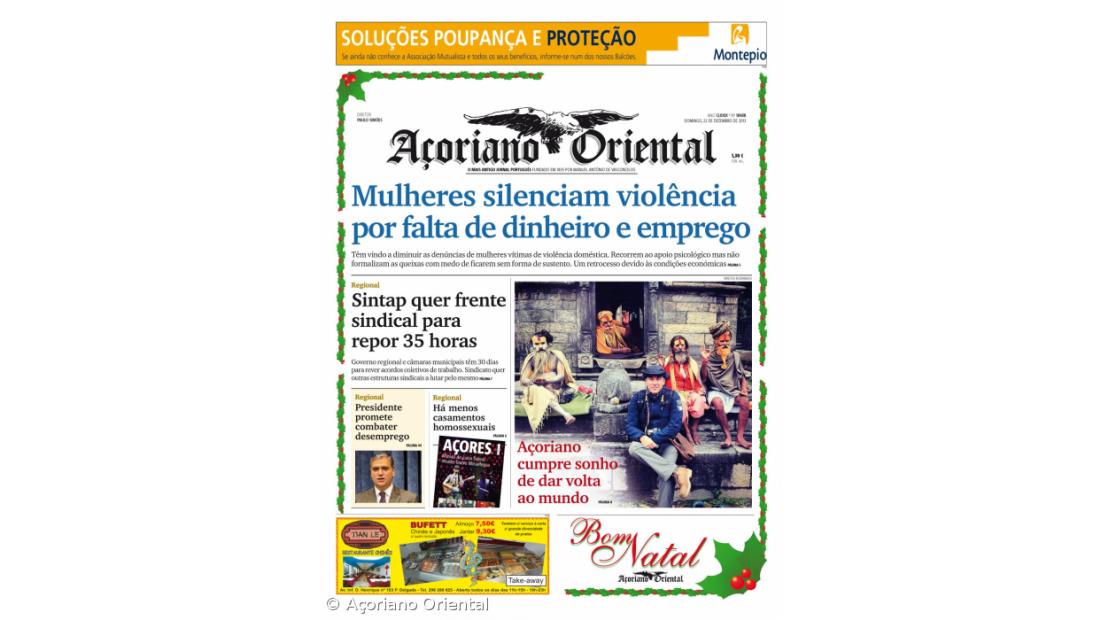 Açoriano cumpre sonho de dar volta ao mundo em 80 dias é o grande destaque de foto. Durval Faria visitou 18 países e 39 locais e aventura vai ser agora relatada em livro. Presidente promete combater desemprego é a tónica da mensagem de Natal de Vasco Cordeiro e há menos casamentos homossexuais são outros títulos de primeira página