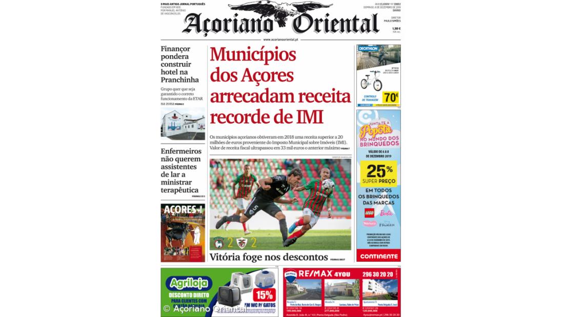 “Vitória foge nos descontos” é o título da manchete fotográfica em alusão ao empate (2-2) entre o Marítimo e o Santa Clara, num jogo de futebol a contar para a I Liga. “Finançor pondera construir hotel na Pranchinha” e “Enfermeiros não querem assistentes de lar a ministrar terapêutica” são os restantes títulos de capa do Açoriano Oriental.
