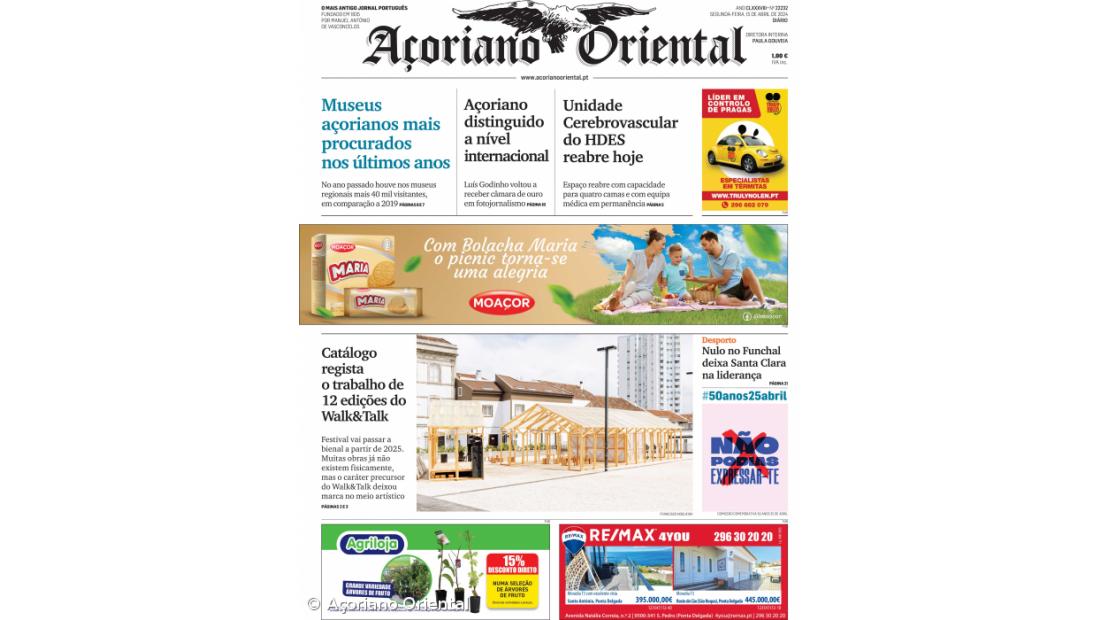 "Catálogo regista o trabalho de 12 edições do Walk&Talk" é a manchete fotográfica. "Unidade Cerebrovascular do HDES reabre hoje", "Açoriano distinguido a nível internacional" e "Nulo no Funchal deixa Santa Clara na liderança" são os restantes títulos de capa do Açoriano Oriental.