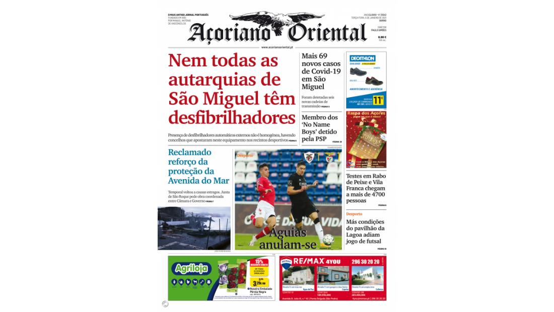 "Reclamado reforço da proteção da Avenida do Mar", "Águias anulam-se", "Mais 69 novos casos de Covid-19 em São Miguel", "Membro dos ‘No Name Boys’ detido pela PSP", "Testes em Rabo de Peixe e Vila Franca chegam a mais de 4700 pessoas" e "Más condições do pavilhão da Lagoa adiam jogo de futsal" são outros destaques desta edição.