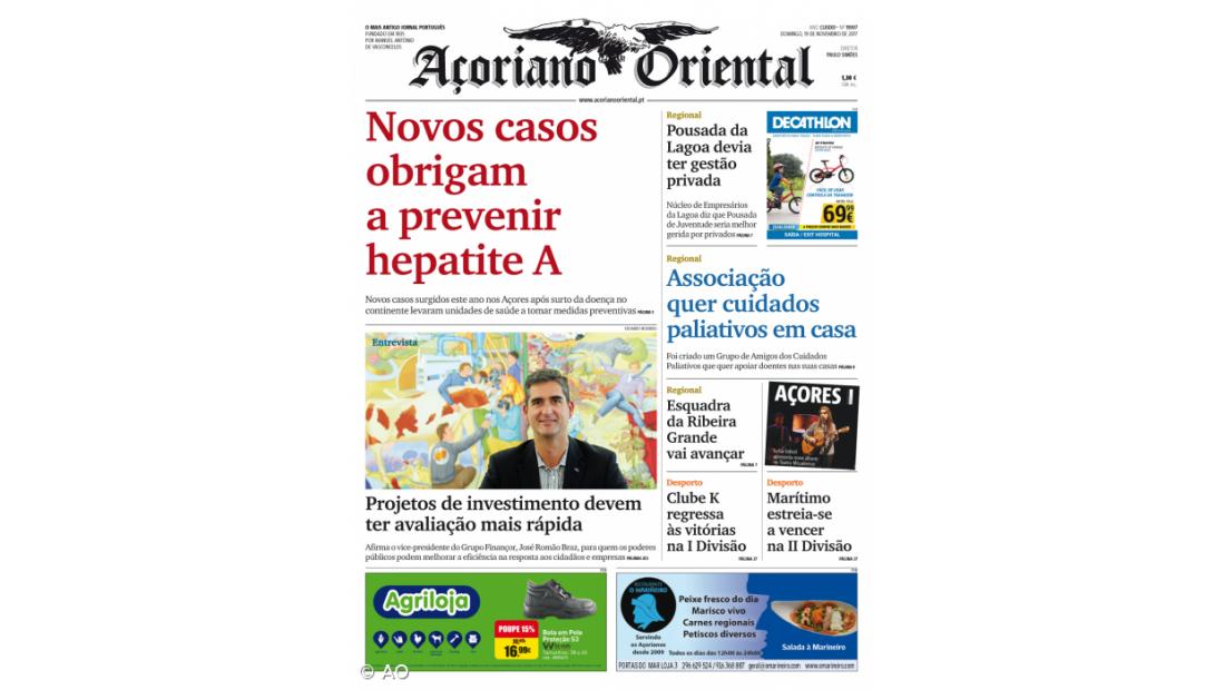 Os surgimento este ano de novos casos nos Açores após um surto no continente e as medidas preventivas da hepatite A tomadas pelas unidades de saúde da Região estão em destaque no Açoriano Oriental de domingo, 19 de novembro de 2017.