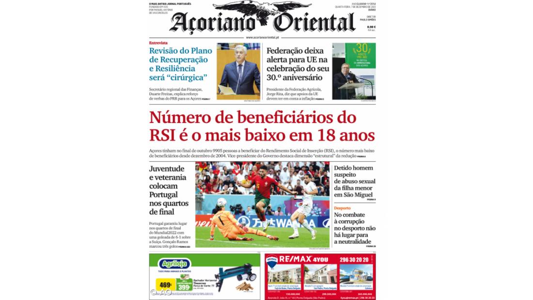"Detido homem suspeito de abuso sexual da filha menor", "Revisão do Plano de Recuperação e Resiliência será 'cirúrgica'" e "Federação deixa alerta para UE na celebração do seu 30.º aniversário" são outros destaques do jornal.