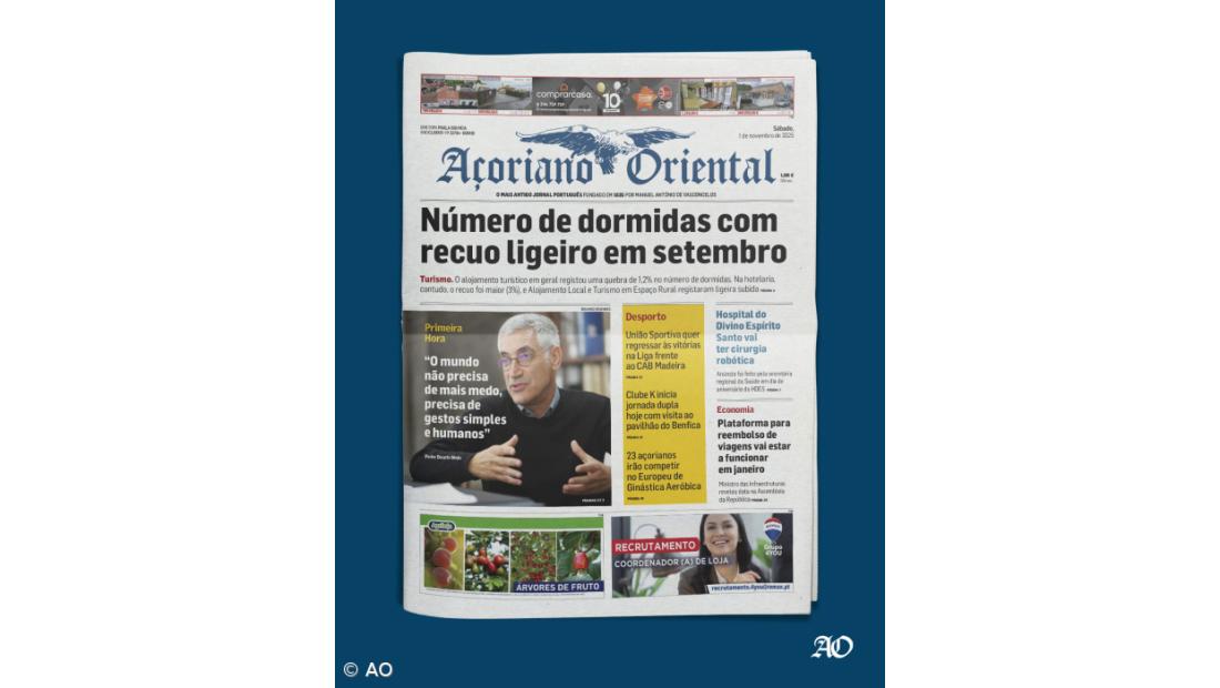 O recuo no número de dormidas turísticas nos Açores em setembro, face ao mesmo mês do ano anterior, contrariando um longo ciclo consecutivo de subidas, está em destaque no Açoriano Oriental de sábado, 1 de novembro de 2025.
