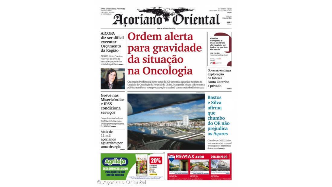 A manchete do Açoriano Oriental noticia a existência, segundo a Ordem dos Médicos, de cerca de 300 doentes a aguardar consulta na Unidade de Oncologia do hospital de Ponta Delgada.