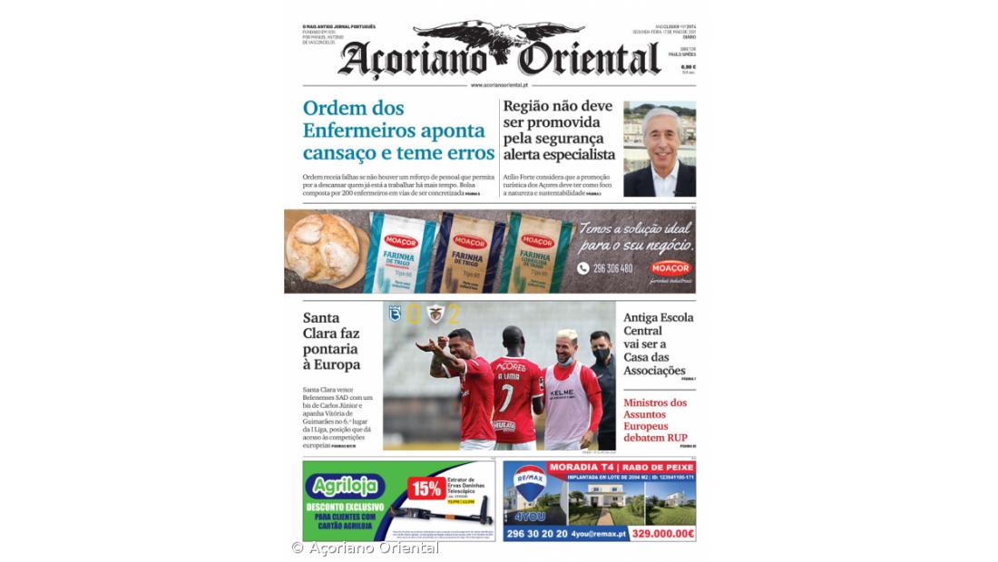 "Santa Clara faz pontaria à Europa" é a manchete fotográfica. "Região não deve ser promovida pela segurança, alerta especialista", "Antiga Escola Central vai ser a Casa das Associações" e "Ministros dos Assuntos Europeus debatem RUP" são os restantes títulos de capa do Açoriano Oriental.