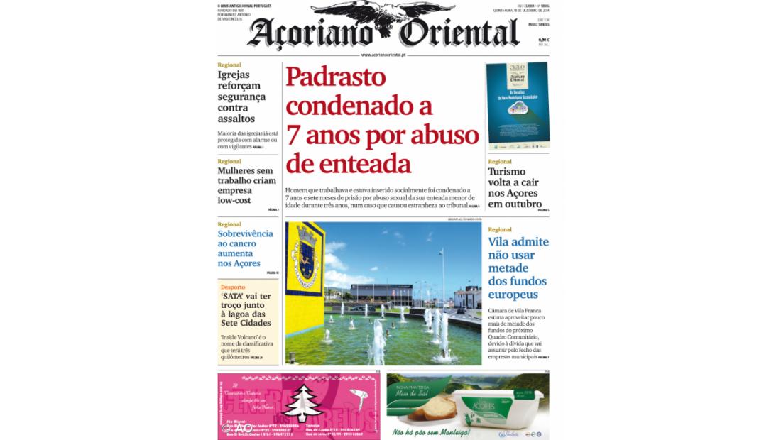 A condenação de um homem pelo Tribunal de Ponta Delgada a 7 anos e sete meses de prisão por abuso sexual de uma enteada menor de idade durante três anos está em destaque no Açoriano Oriental de quinta-feira, 18 de dezembro de 2014.
