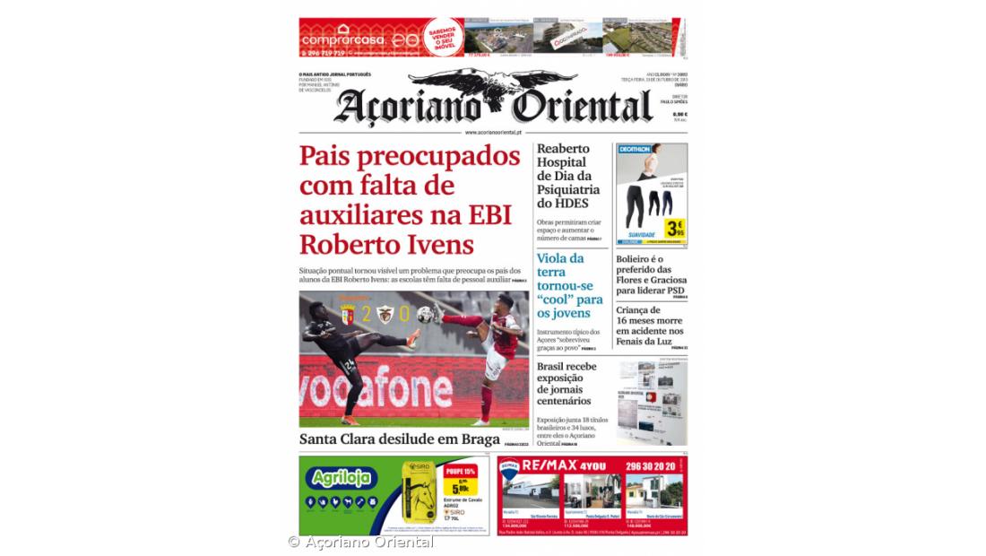 "Santa Clara desilude em Braga" é o título da manchete fotográfica. "Reaberto Hospital de Dia da Psiquiatria do HDES", "Viola da terra tornou-se 'cool' para os jovens", "Brasil recebe exposição de jornais centenários", "Bolieiro é o preferido das Flores e Graciosa para liderar PSD" e "Criança de 16 meses morre em acidente nos Fenais da Luz" são os restantes títulos de capa do Açoriano Oriental.