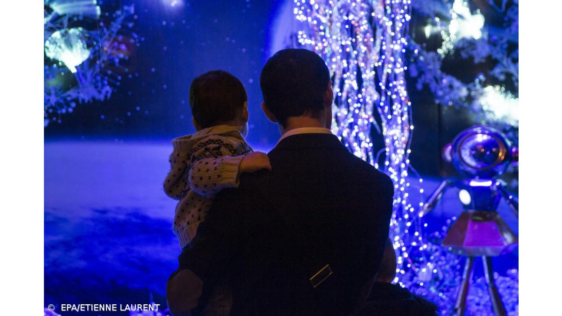 Famílias observam montras das galerias Lafayette, em Paris, na véspera de Natal