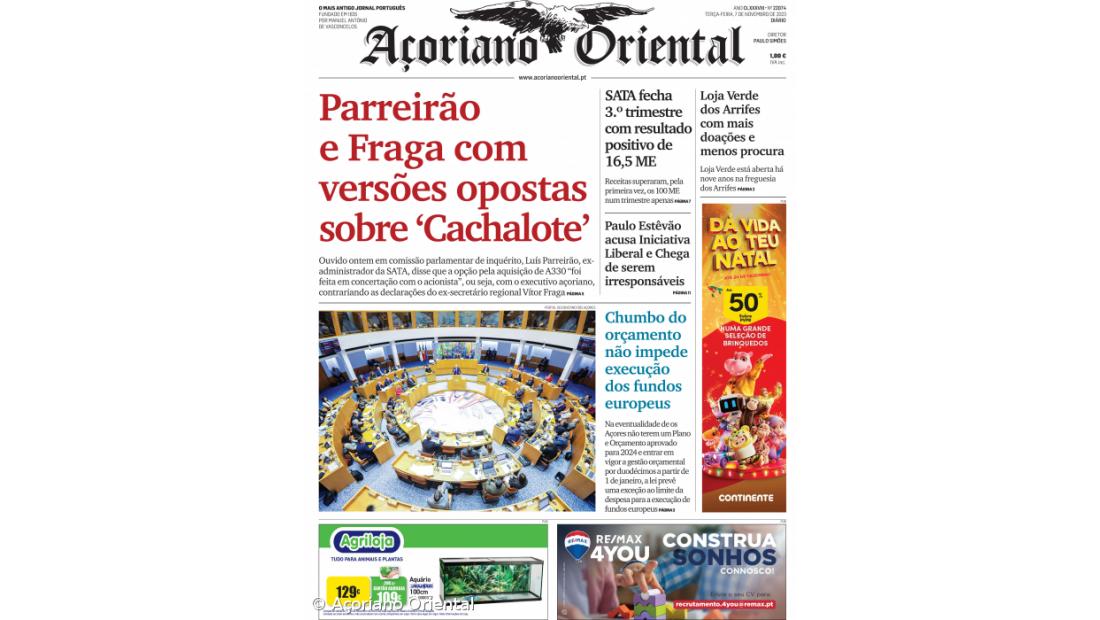 A manchete do Açoriano Oriental noticia que o ex-administrador da SATA, Luís Parreirão, e o ex-secretário regional Vítor Fraga apresentaram discursos contraditórios na comissão parlamentar de inquérito sobre a transportadora aérea açoriana.