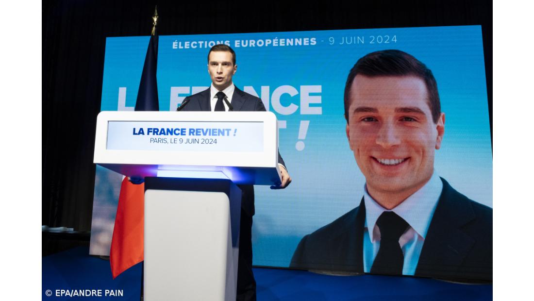 Nas eleições europeias de domingo, a lista encabeçada por Bardella obteve a vitória, com 31,37% dos votos, mais do dobro dos votos obtidos pelo partido de Macron (14,6%).