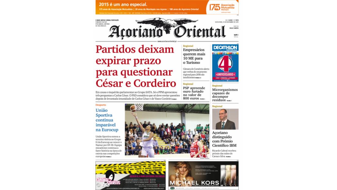 Capa de hoje dá destaque fotográfico à terceira vitória da equipa micaelense União Sportiva, ao apelo da Câmara do Comércio e Indústria para que o governo regional inscreva mais verbas no orçamento regional para 2016, à distinção de um investigador açoriano com o Prémio Científico IBM e a um projeto de investigação que já concluiu que os micorganismos dos Açores decompõem rapidamente resíduos.