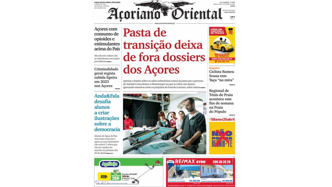 O substituição do anel de cabos submarinos foi o único assunto a envolver os Açores na pasta de transição que o Governo cessante de António Costa deixou ao novo governo liderado por Luís Montenegro. O assunto está em destaque no Açoriano Oriental de quinta-feira, 4 de abril de 2024.