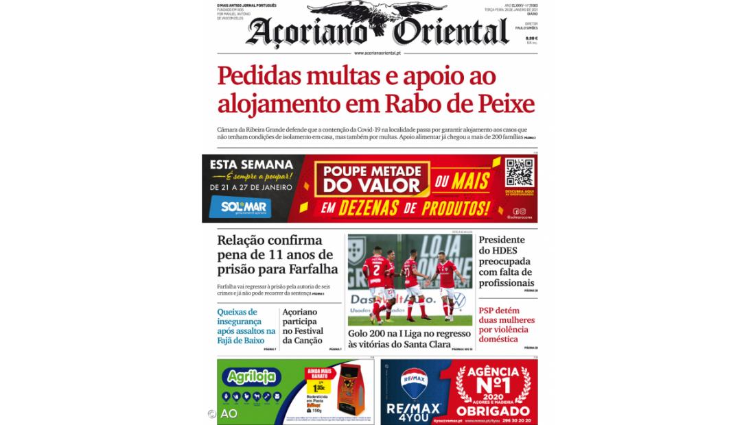 O pedido da Câmara da Ribeira Grande, para quem a contenção da Covid-19 em Rabo de Peixe passa por garantir alojamento aos casos positivos que não tenham condições de isolamento, mas também por multas, está em destaque no Açoriano Oriental de terça-feira, 26 de janeiro de 2021.