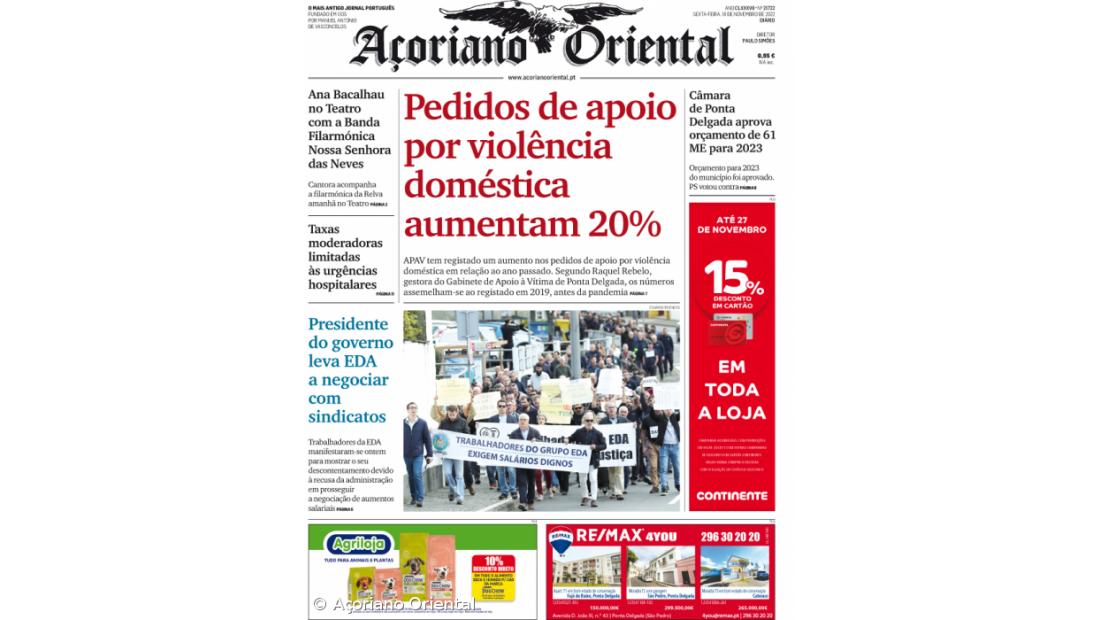 A manchete do Açoriano Oriental noticia que a APAV tem registado este ano um aumento nos pedidos de apoio por violência doméstica em relação a 2021.