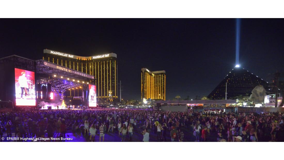 Testemunhas relatam que na parte final do concerto do músico Jason Aldean ouviram-se "disparos de armas automáticas" e que muitas pessoas que se encontravam no local fugiram para a cave do edifício vizinho ao recinto do conserto.