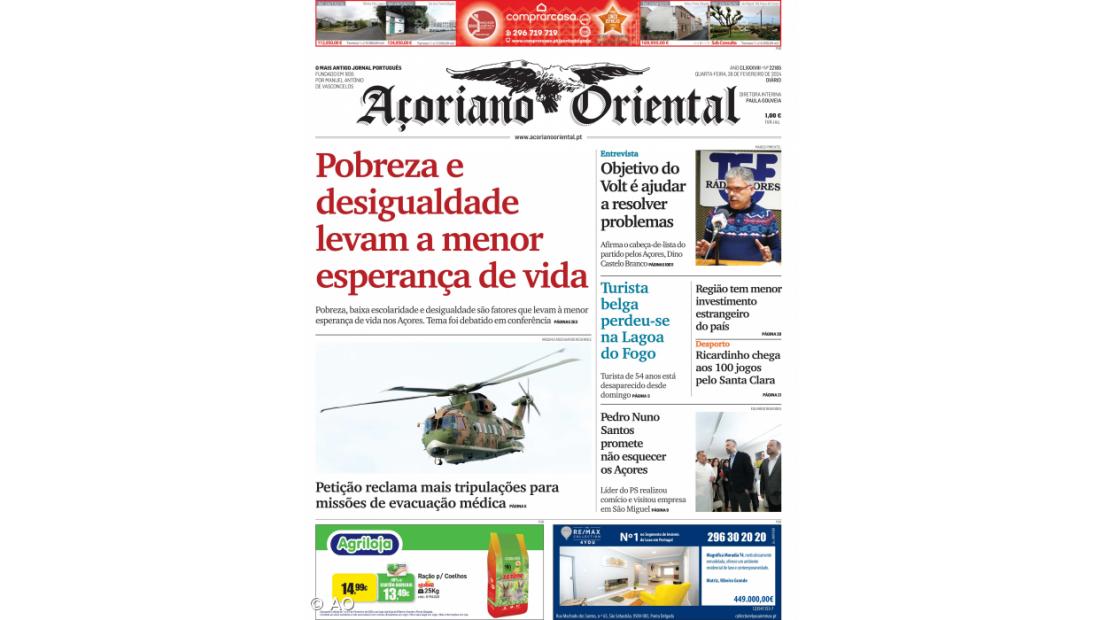 Pobreza, baixa escolaridade e desigualdade são fatores que levam à menor esperança de vida nos Açores. O assunto está em destaque no Açoriano Oriental de quarta-feira, 28 de fevereiro de 2024.