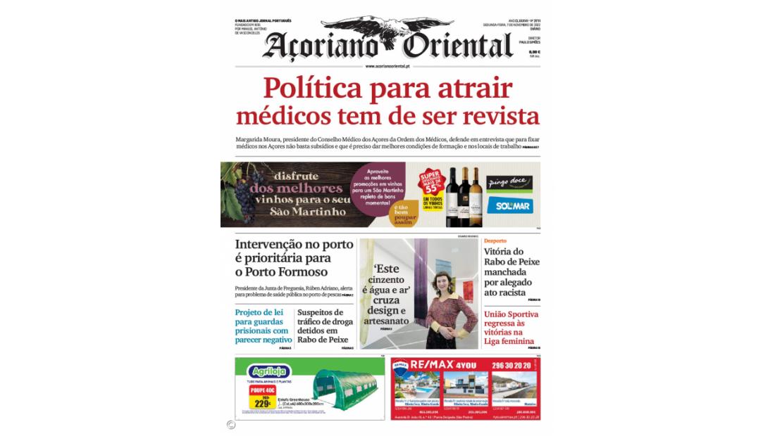 "Política para atrair médicos tem de ser revista" é a manchete da edição desta segunda-feira do Açoriano Oriental.