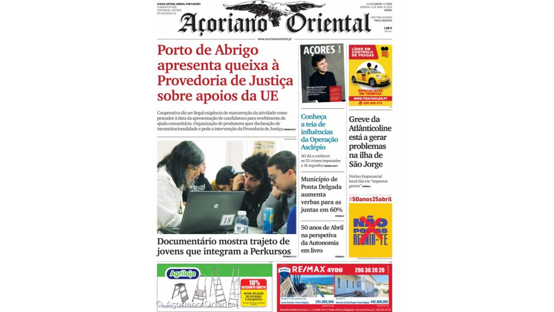 "Documentário mostra trajeto de jovens que integram a Perkursos" é a manchete fotográfica. "Conheça a teia de influências da Operação Asclépio", "Município de Ponta Delgada aumenta verbas para as juntas em 60%", "50 anos de Abril na perspetiva da Autonomia em livro" e "Greve da Atlânticoline está a gerar problemas na ilha de São Jorge" são os restantes títulos de capa do Açoriano Oriental.