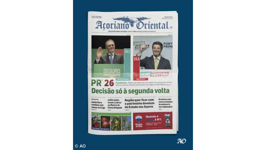 Açoriano Oriental destaca na capa que a escolha do Presidente da República só será feita numa segunda volta entre António José Seguro e André Ventura