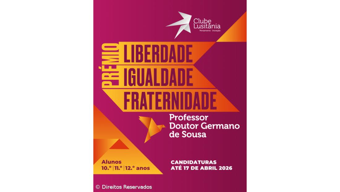 A Associação Clube Lusitânia lançou o Prémio “Liberdade, Igualdade e Fraternidade | Professor Doutor Germano de Sousa”, dirigido a estudantes do ensino secundário de Portugal Continental e das regiões autónomas dos Açores e da Madeira. O concurso convida os jovens a desenvolver trabalhos escritos ou em vídeo sobre os valores fundamentais das sociedades democráticas, com candidaturas abertas até 17 de abril.