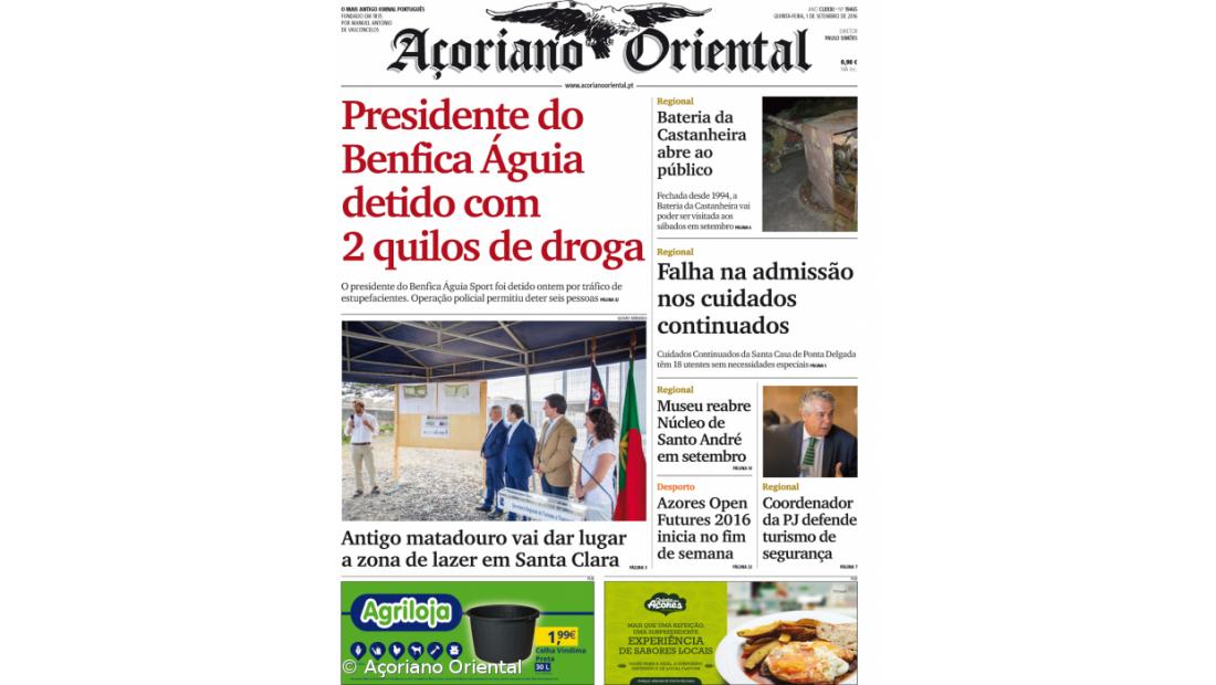 A manchete do Açoriano Oriental destaca que o presidente do Benfica Águia foi detido por tráfico de estupefacientes na sequência de uma operação policial que permitiu deter seis pessoas.