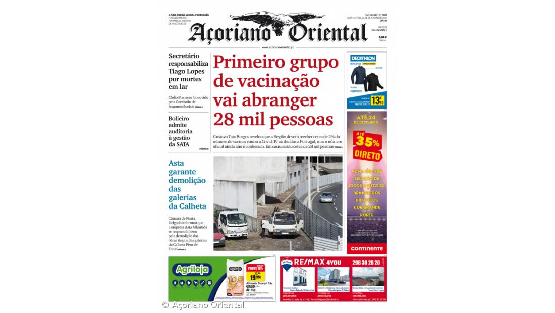 "Primeiro grupo de vacinação vai abranger 28 mil pessoas" é a manchete do Açoriano Oriental