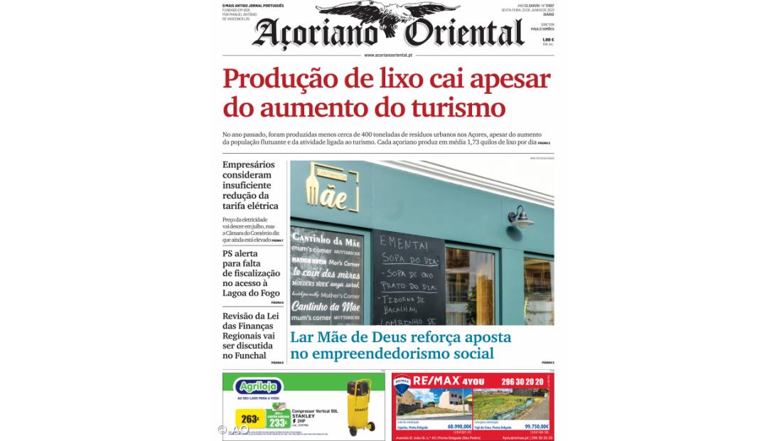"Empresários consideram insuficiente a redução da tarifa elétrica" e "PS alerta para falta de fiscalização no acesso à Lagoa do Fogo" são outros destaques do jornal.