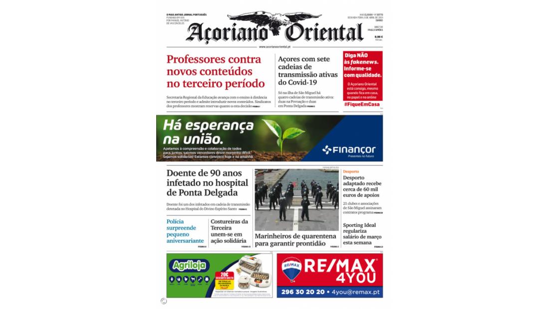 "Açores com sete cadeias de transmissão ativas do Covid-19", "Marinheiros de quarentena para garantir prontidão", "Costureiras da Terceira unem-se em ação solidária" e "Polícia surpreende pequeno aniversariante" são outros destaques desta edição.