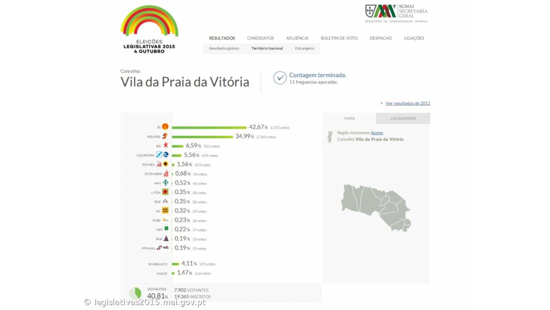 O PS foi a força política mais votada com 42,67% dos votos no concelho da Praia da Vitória, de acordo com os dados da Secretaria-Geral do Ministério de Administração Interna - Administração Eleitoral.