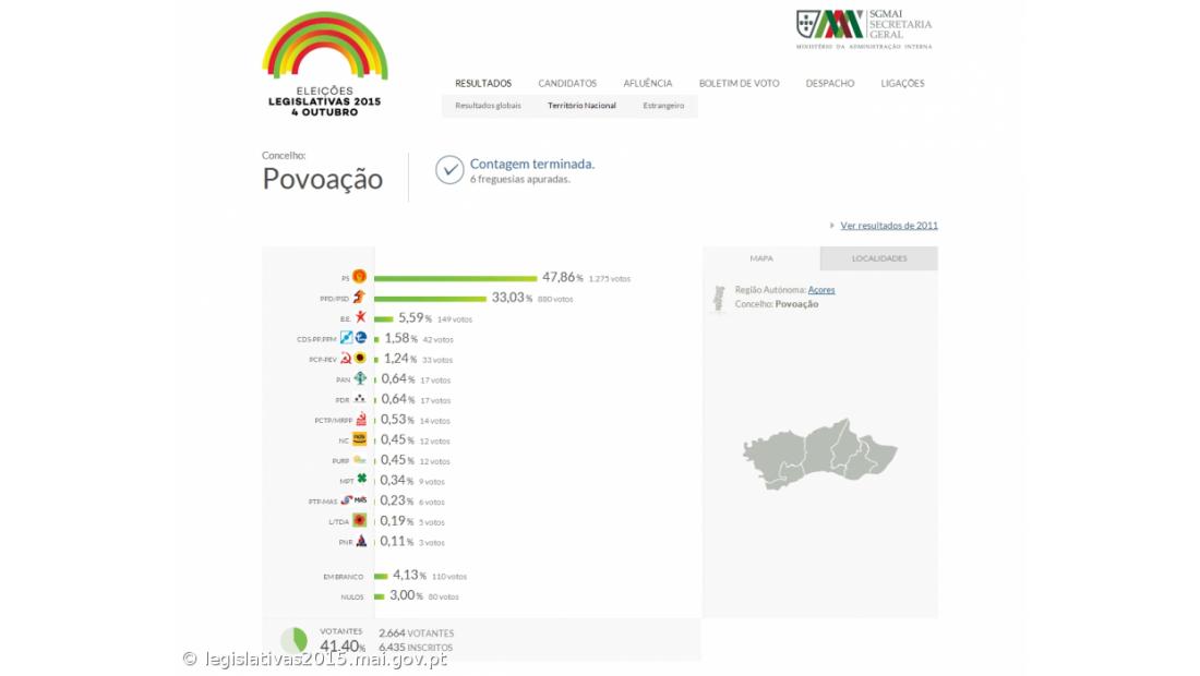 O PS foi a força política mais votada com 47,86% dos votos no concelho da Povoação, de acordo com os dados da Secretaria-Geral do Ministério de Administração Interna - Administração Eleitoral.