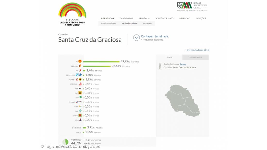 O PS foi a força política mais votada com 49,75% dos votos no concelho de Santa Cruz da Graciosa, de acordo com os dados da Secretaria-Geral do Ministério de Administração Interna - Administração Eleitoral.