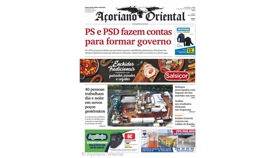 "PS e PSD fazem contas para formar governo" é a manchete do Açoriano Oriental
