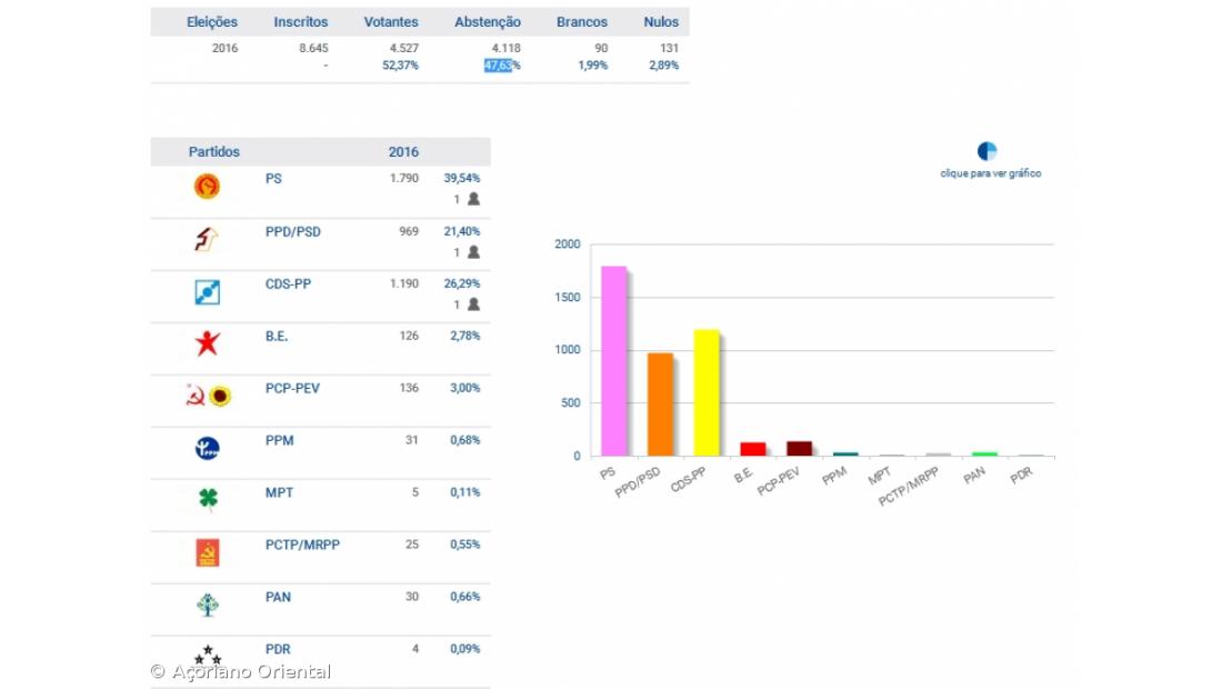 Terminada a contagem a contagem de votos na ilha de São Jorge, o PS tem 39,54 por cento, o PSD tem 21,40 por cento e o CDS-PP tem 21,40 por cento dos votos.