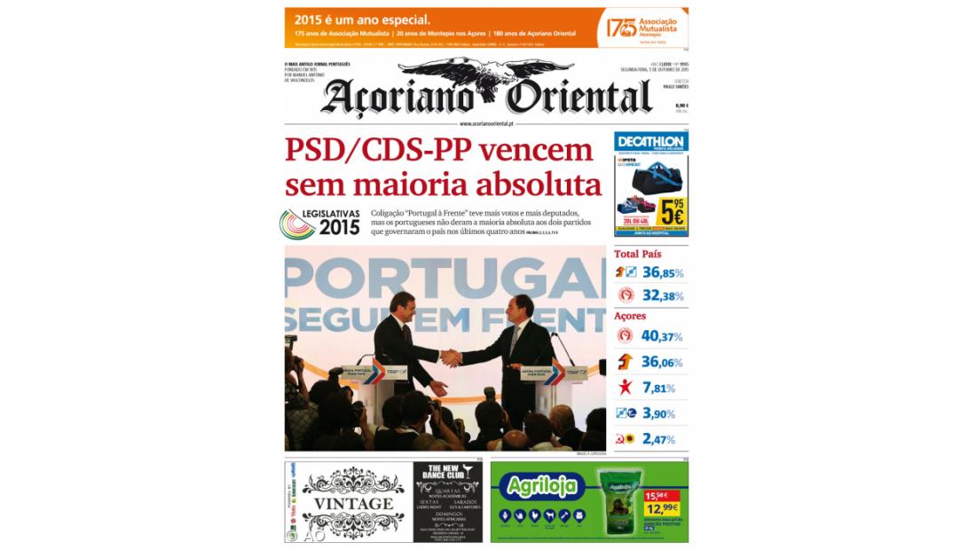 A primeira página do jornal é dedicada em exclusivo ao especial eleições que o jornal hoje publica, dando conta da decisão dos portugueses em dar a vitória à coligação do PSD/CDS-PP "Portugal à Frente", mas sem maioria absoluta.