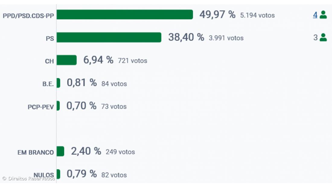 O PS obteve 38,40 %, seguido do Chega com 6,94 %, Bloco de Esquerda com 0,81 % e PCP-PEV com 0,70 %