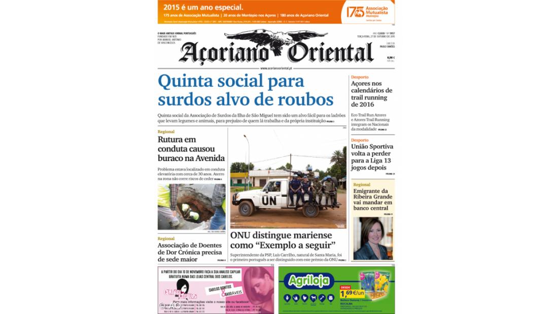 "ONU distingue mariense como 'Exemplo a seguir'" é o título que acompanha a foto principal da capa, onde se mostra ainda o buraco causado por uma rutura em conduta na Avenida Infante D. Henrique, em Ponta Delgada.