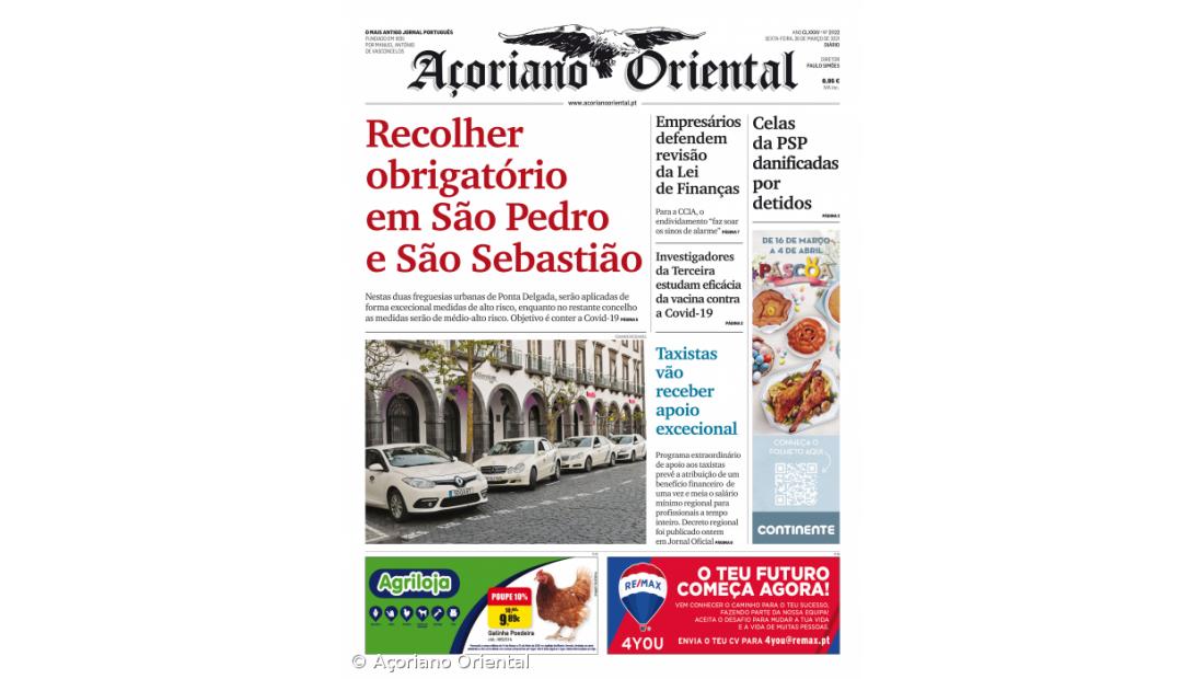 "Taxistas vão receber apoio excecional" é o título da manchete fotográfica. "Empresários defendem revisão da Lei de Finanças", "Investigadores da Terceira estudam eficácia da vacina contra a Covid-19" e "Celas da PSP danificadas por detidos" são os restantes títulos de capa do Açoriano Oriental.
