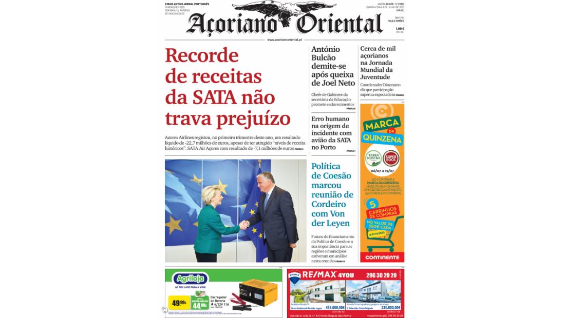 "Política de Coesão marcou reunião de Cordeiro com Von der Leyen", "António Bulcão demite-se após queixa de Joel Neto", "Erro humano na origem de incidente com avião da SATA no Porto" e "Cerca de mil açorianos na Jornada Mundial da Juventude" são os outros destaques deste jornal.