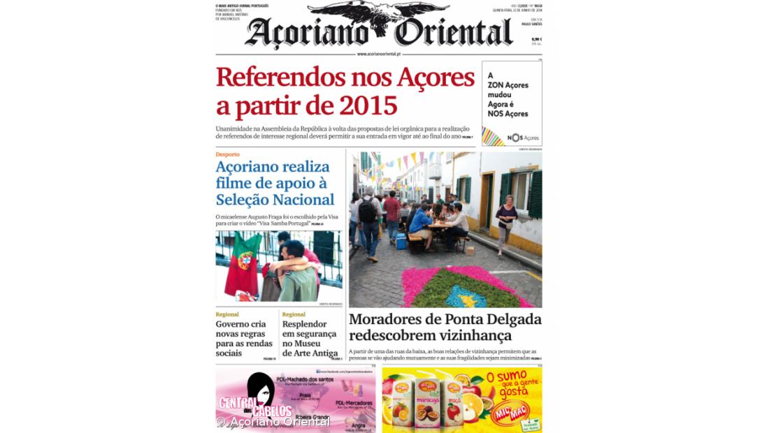 "Referendos nos Açores a partir de 2015" é a manchete do Açoriano Oriental