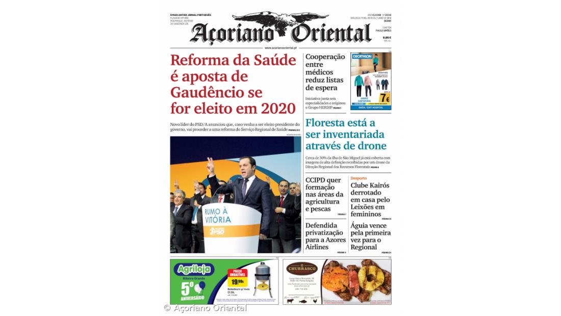 "Reforma da Saúde é aposta de Gaudêncio se for eleito em 2020" é a manchete do Açoriano Oriental