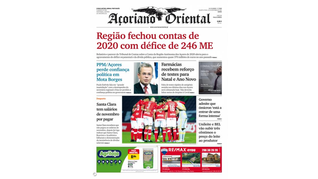 A edição de hoje do jornal destaca ainda "PPM/Açores perde confiança política em Mota Borges" e "Farmácias recebem reforço de testes para Natal e Ano Novo".