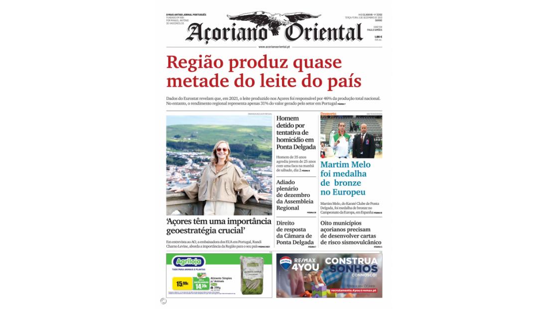 A primeira página do jornal destaca ainda "Homem detido por tentativa de homicídio em Ponta Delgada" e "Adiado plenário de dezembro da Assembleia Regional".