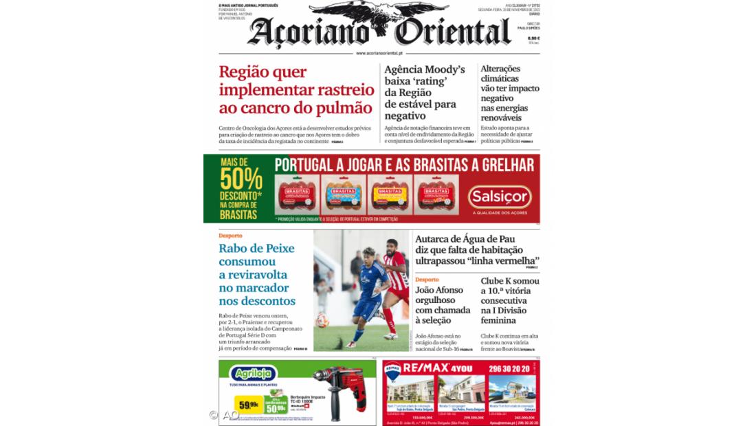 A redução do 'rating' da Região Autónoma dos Açores para negativo pela agência Moody's é outra notícia de destaque nesta edição, onde também é noticiado que as alterações climáticas vão ter impacto nas energias renováveis e o autarca de Água de Pau faz um alerta para o problema da falta de habitação na localidade.