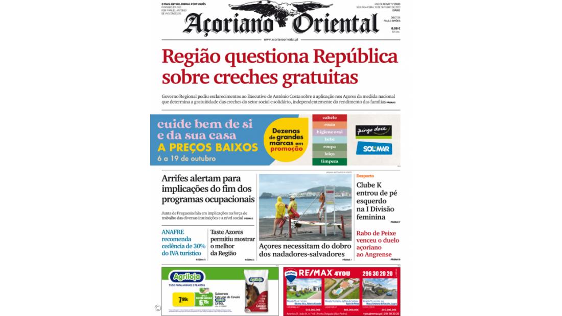 A primeira página do jornal de hoje dá ainda destaque a "Arrifes alertam para implicações do fim dos programas ocupacionais"; "ANAFRE recomenda cedência de 30% do IVA turístico" e "Taste Azores permitiu mostrar o melhor da Região".